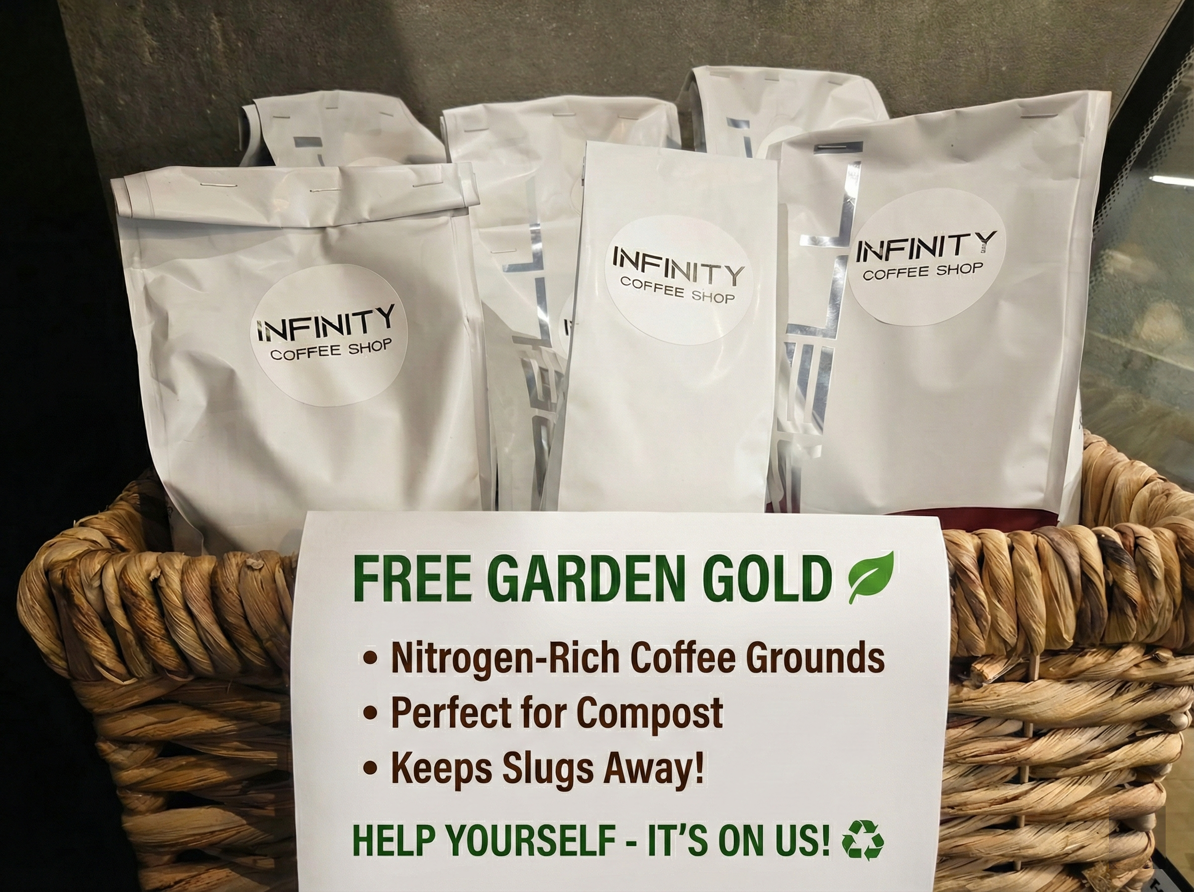 Simply pop into INFINITY Coffee Shop and grab a bag of our used coffee grounds from the basket near the counter. No need to ask, no need to buy anything — just take what you need for your garden.